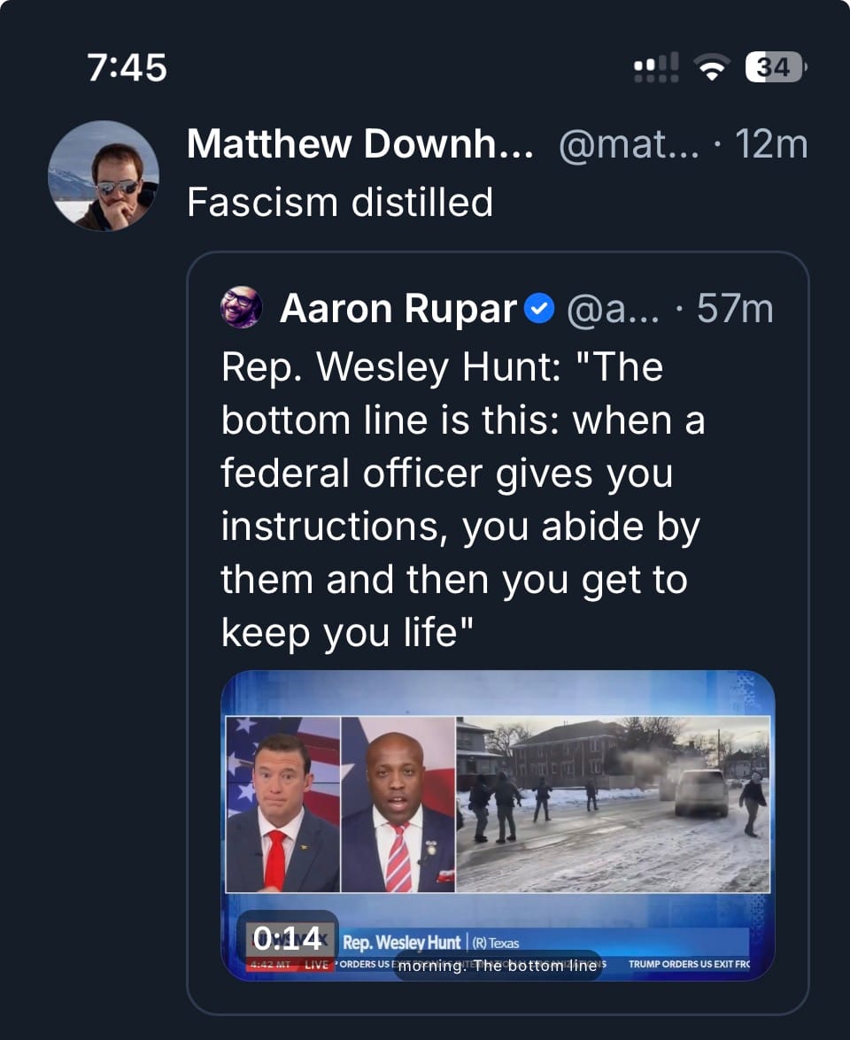 From what I'm gathering from my readings on social media, there are many (not all are bots, though some are) out there who are still trying to hide this fact from themselves, by parroting the government's talking points about the murder of Good. They attempt to portray a world of desirable order and control, in which anyone beaten, kidnapped, or killed by officials must have deserved it. They're saying things like this: