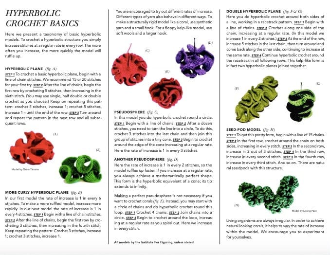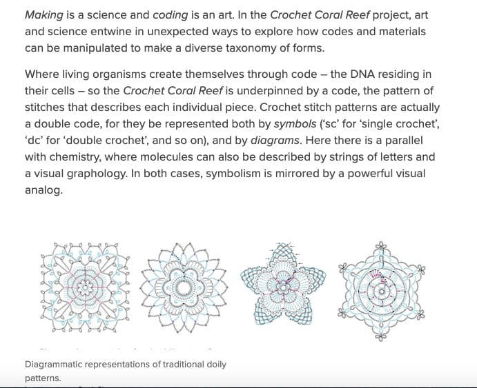 With over 50 satellite reefs (and more in progress) and over 20,000 participants across the globe, this project is also working to promote excitement around scientific understanding, and yes, math! Their organization is, after all, named the Institute for Figuring. Here is a shot from their site that lays out this premise better than I can:
