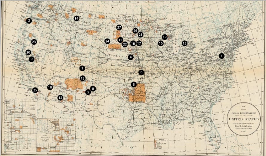 One includes this map that "shows the locations of off-reservation Indian Boarding Schools throughout the United States, numbered in the order in which each began operations under government auspices." Here it is in interactive form, to more easily see the schools in relation to the reservations, which appear in orange: https://carlisleindian.dickinson.edu/sites/default/files/docs-resources/Locations_IndianBoardingSchools_US_Map-Extra.pdf