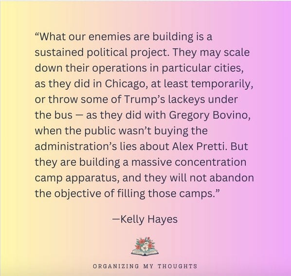 I have more thoughts about time and attention, but I'll save those for another newsletter. Right now, I'd like to call your attention to an important conversation between two of my "professors," Menominee activist Kelly Hayes, whose book, Let This Radicalize You I've referenced in several of these posts, and Andrea Pitzer, whose work on concentration camps I have shared here several times as well.