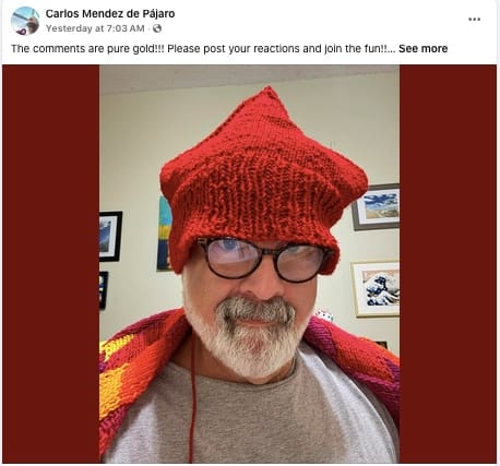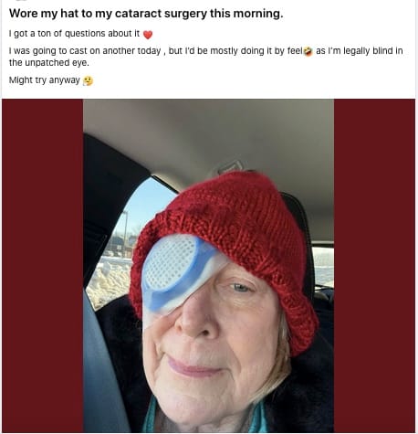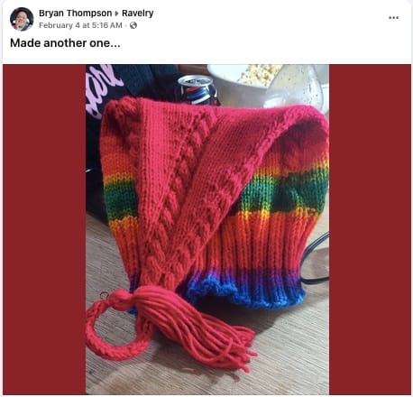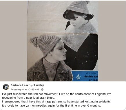 Ditto for all the clever adaptations people are finding to suit their skills: crochet versions, sewn versions, and other design innovations (like tiny pins, doll hats, and earrings). Some are learning to knit, simply in order to make this hat. People with injuries, health issues, or in one case, recovering from a life-threatening brain bleed are being drawn to trying the project. Many are delighted to reclaim red headwear.